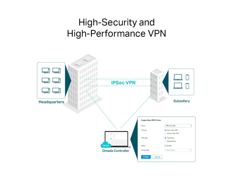 Automatická IPSec VPN jedním kliknutím ulehčuje konfiguraci VPN a zjednodušuje vám správu a nasazení sítě. Vestavěný hardware VPN engine umožní podporu a správu stovek IPSec, PPTP, L2TP, SSL VPN a OpenVPN tunelů. Tyto protokoly použijete převážně v podnikovém prostředí, kde je zapotřebí práce z domova či napříč několika pobočkami. Router totiž vytváří VPN (virtuální soukromá síť) s vysokým zabezpečením.