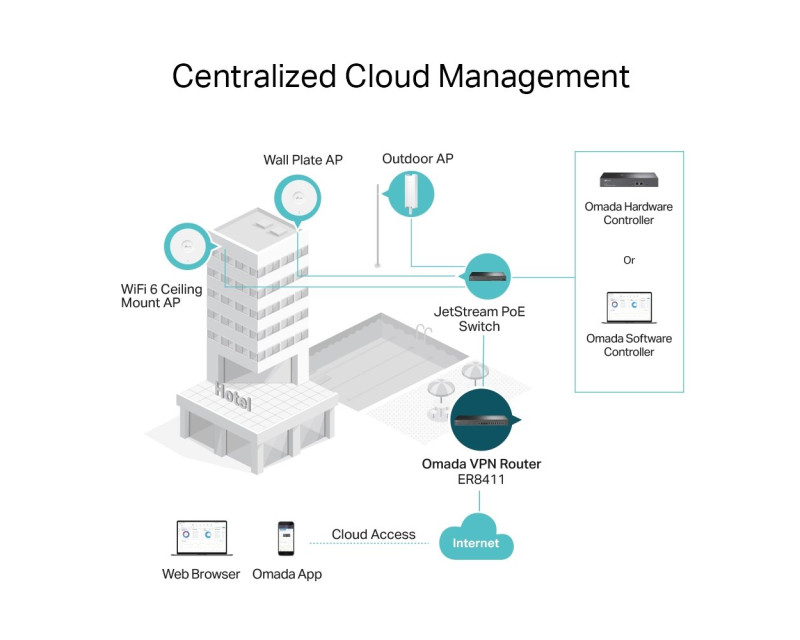 - Centralizovaná správa pomocí cloudového přístupu a aplikace Omada