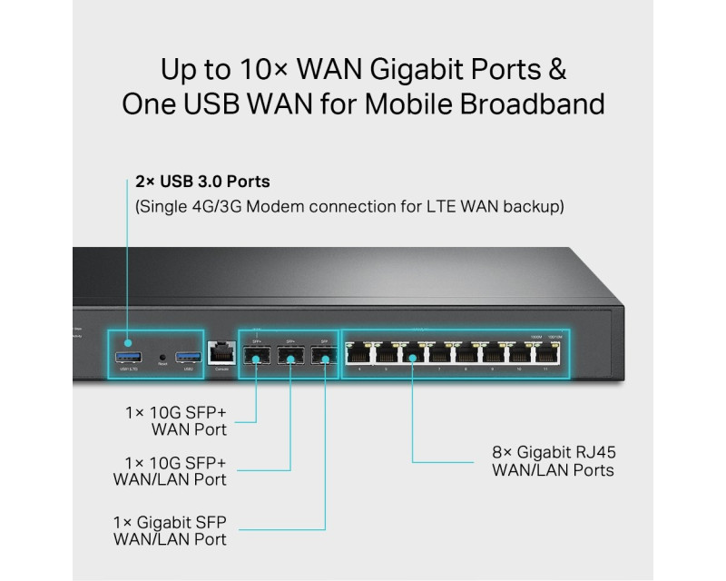 Na routeru najdete celkem 10 WAN portů a 1 USB WAN pro mobilní širokopásmové připojení. Optické a RJ45 WAN porty mají funkci vyrovnávání zatížení a zvyšují míru využití vícelinkového širokopásmového připojení. Router navíc podporuje až 2 300 000 souběžných relací a má 4jádrový procesor 2,2 GHz. Dopřejte si maximální a vysokokapacitní výkon tohoto zařízení od TP-Link.