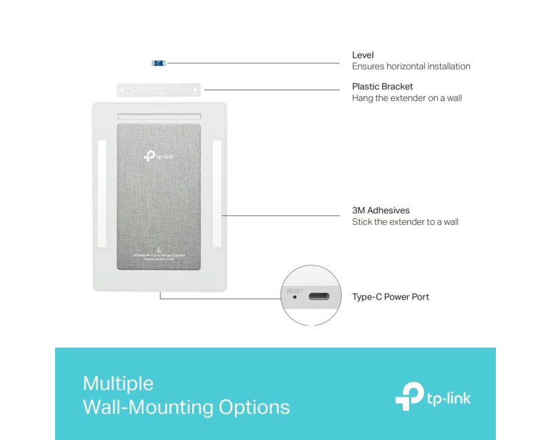 Extender TP-Link má kompaktní a velmi tenké rozměry. Nezabírá tedy skoro žádné místo ve vaší domácnosti. Zároveň ho můžete nalepit nebo namontovat na stěnu pomocí lepicích pásků 3M a přiloženého plastového držáku (součástí balení).
