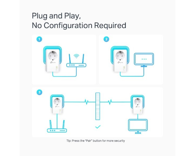 Každá z jednotek je vybavena jedním ethernetovým portem, svoji domácí datovou síť tak můžete z elektrické zásuvky vyvést i v místě, kde chybí běžné datové kabely. Jeden z adaptérů jednoduše zapojíte do zásuvky a připojíte k routeru. Druhý adaptér zapojíte v blízkosti počítače, který potřebujete připojit, kdekoliv v domě a pak už jen připojíte počítač LAN kabelem.