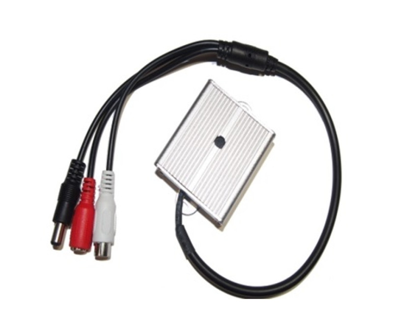 Mikrofon pro CCTV (DVR, kamery), AGC funkce (automatická regulace zisku), nastavitelná citlivost, napájení DC 6 – 12 V, odběr 12 mA, frekvenční rozsah 200 Hz – 10 kHz, výstupní impedance 600 ohmů, oblast záběru až 100 metrů čtverečních, včetně konektorů (1x DC vstup, 1x DC výstup, 1x cinch audio výstup). Provedení kov - hliník, rozměry 50 x 45 x 18 mm, hmotnost 67 g.