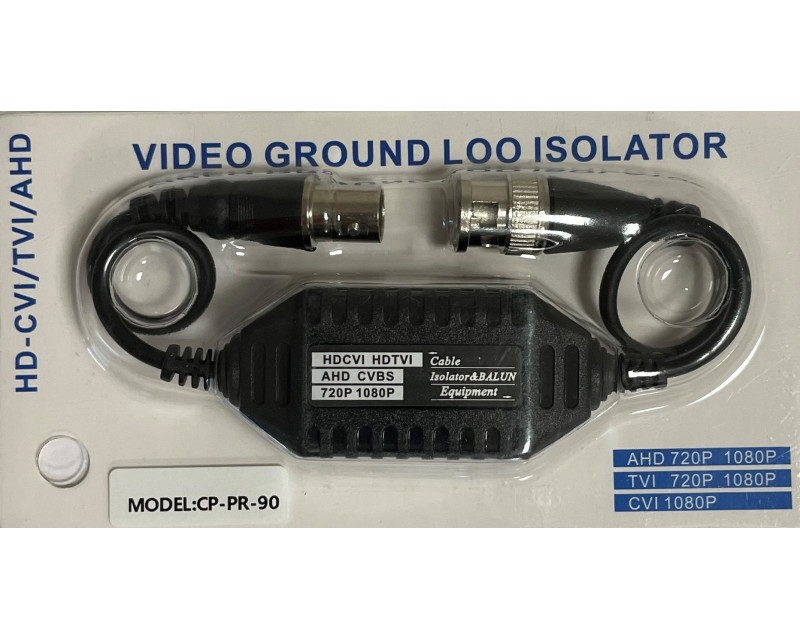 CP-PR-90 izolátor zemní smyčky (ground loop isolator) je pasivní zařízení, které výrazně snižuje či zcela eliminuje rušení signálu. Zabraňuje zkreslení video signálu způsobeného zemními smyčkami, zajišťuje galvanické oddělení signálu a je určeno pro použití v systémech se standardem signálu HD-CVI, AHD, HD-TVI, CVBS (PAL). Eliminuje rozpad, rozmazávání a rolování obrazu, což jsou možné problémy zjištěné při instalaci kamerových systémů.