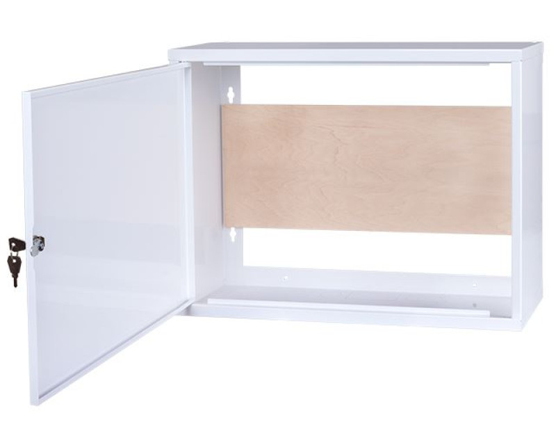 Univerzální kovová skříňka * Univerzální použití * Rozměry: 540 x 420 x 180 mm * Hmotnost: 5.10 Kg * Montáž: zavěsitelné na zeď * Určeno pro vnitřní použití: IP20 * Uzamykatelná přední dvířka, náhodný kód klíče (1x zámek + 2x klíč v balení) * Možnost otočení dveří – levý či pravý pant * Obsahuje montážní desku z překližky (tloušťka 8 mm) * Konstrukce racku přizpůsobena požadavkům ochrany osobních dat (GDPR) pro informace, které musí být chráněny a bezpečně přechovávány * Materiál: železo, tloušťka 0.8 mm, antikorozní úprava * Barva bílá *