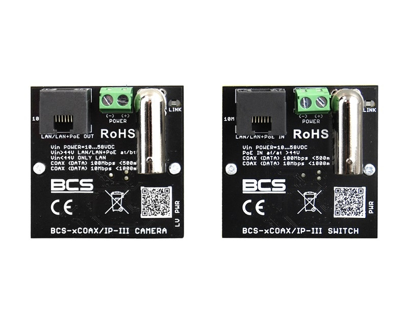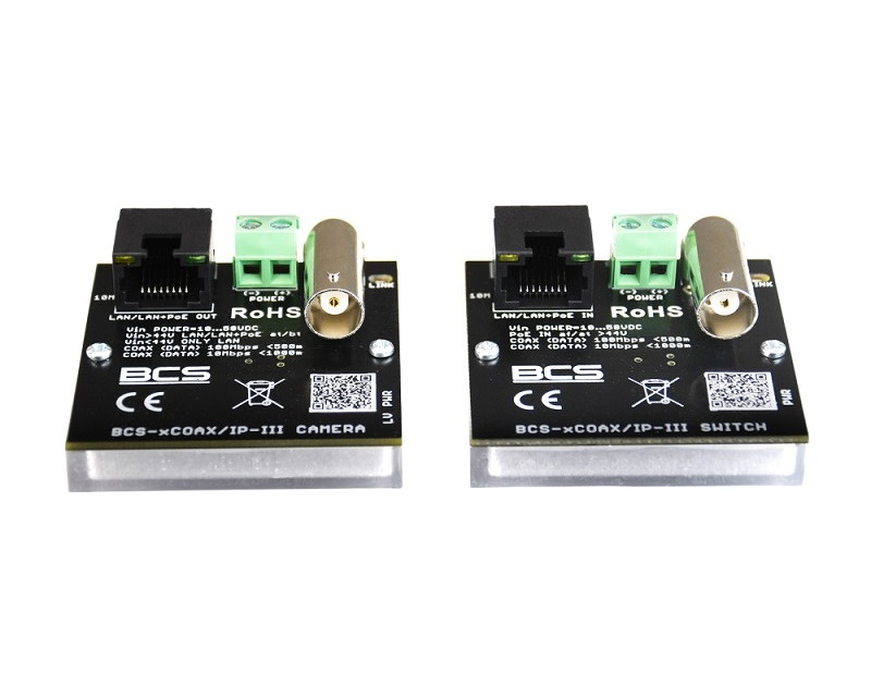 Přenos IP kamer po koaxu BCS Sada převodníků pro přenos LAN a PoE po koaxiálním kabelu. Napájení: pasivní PoE nebo PoE af/at nebo 10-58V DC (Vin <44V = pouze LAN, Vin >44V = LAN+PoE), přenosová rychlost 100Mbps (coax <500m) nebo 10Mbps (coax <1000m), optická signalizace, rozměry 1 kusu 51 x 51 x 23mm