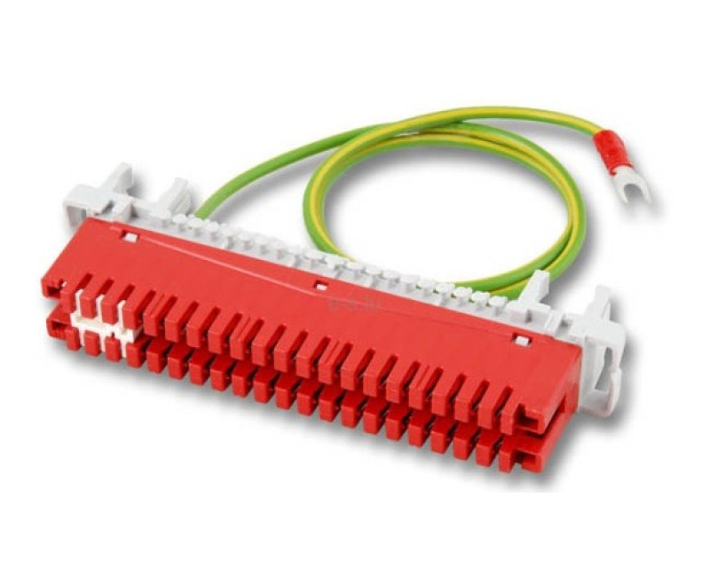 Svorkovnice zemnící červená typu Krone 10 párů s 25cm dlouhým žlutozeleným zemnícím vodičem zakončený okem M4 určená do vany nebo na profil