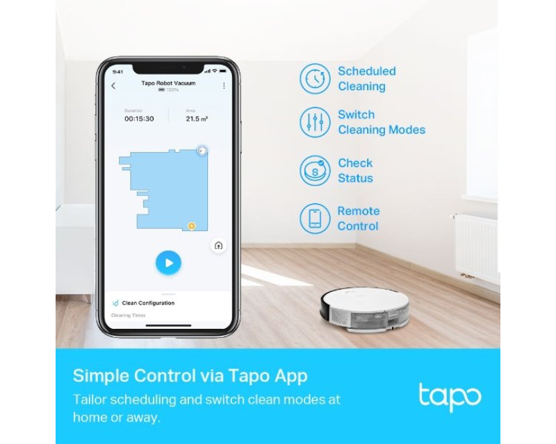 Vysavač Tapo zvládne nepřetržitě vysávat až po dobu 3 hodin. Poté se sám vrátí do stanice. Tam dojde k automatickému nabíjení. Po nabití se vysavač restartuje a pokračuje v práci přesně tam, kde skončil.
