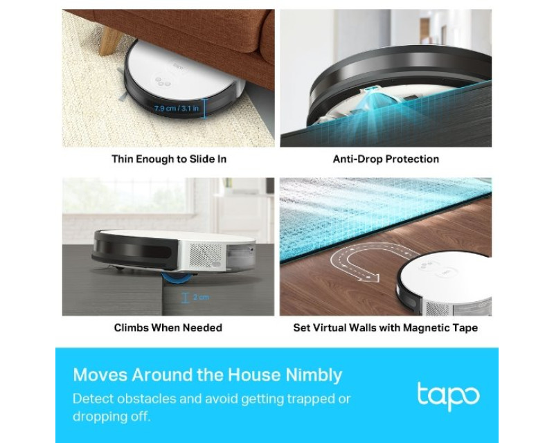 Vysavač TP-Link si naplánuje dráhu tak, aby byla klikatá a aby snížil počet vynechaných míst. Pokročilé senzory zabrání vysavači narážet do věcí, uvíznout pod nábytkem nebo sjet ze schodů. Snadno překoná dveřní prahy a tlusté koberce s výškou do 2 cm, takže ho nebudete muset neustále hlídat. Nastavte si časový plán a vytvořte virtuální zdi pro oblasti, do kterých robota nechcete pouštět. Zároveň vás jistě potěší, že Tapo RV10 Plus při přechodu z tvrdé podlahy na koberec zvýší výkon, aby docílil dokonalých výsledků.