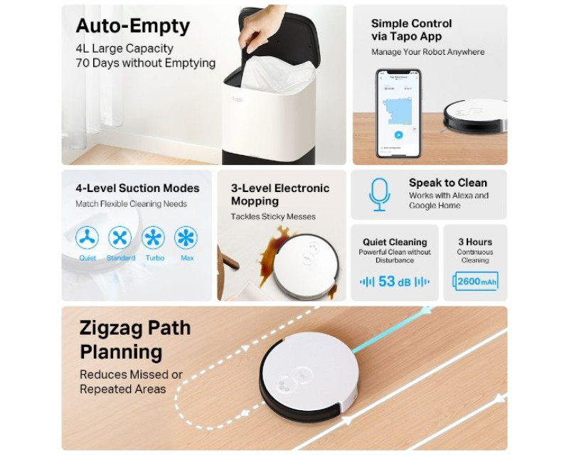 Toužíte po dokonale čisté domácnosti? Robotický vysavač TP-Link Tapo RV10 Plus s automatickým vyprazdňovačem vás zbaví veškerých nečistot na podlaze i v kobercích. Díky silnému sacímu výkonu 2 000 Pa pečlivě čistí místnosti ve vašem domě. HEPA filtr navíc zachytí až 99,9 % prachu, což ocení nejen alergici.