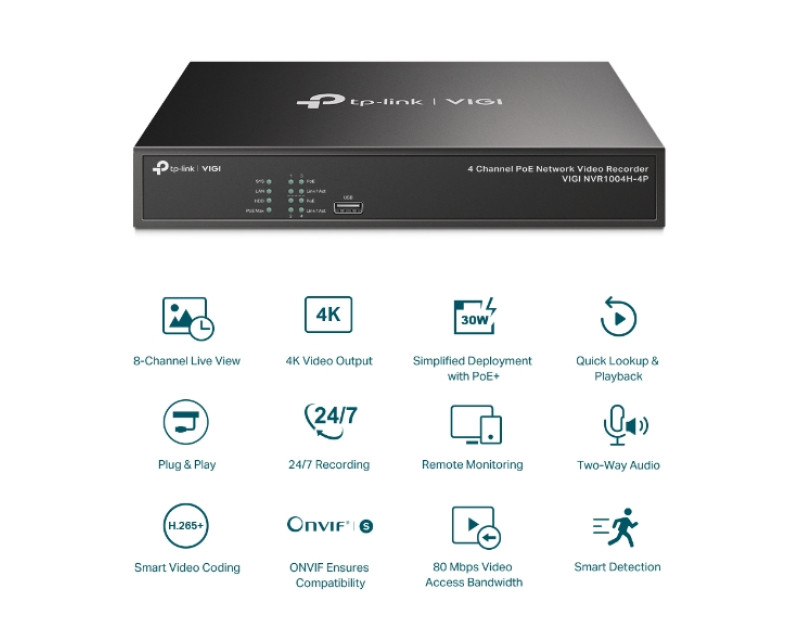 Zařízení TP-Link VIGI NVR1004H-4P s 4K HDMI video výstupem zaznamenává videa z bezpečnostních kamer a usnadňuje jejich správu. Poskytne vám vysoké rozlišení obrazu až 8MP. Ohlídáte si dění na svém pozemku či ve svém podniku (prodejna, sklad, restaurace, penzion). 4kanálový displej vám zobrazí záběry ze 4 kamer najednou. Neuteče vám tedy žádný detail.