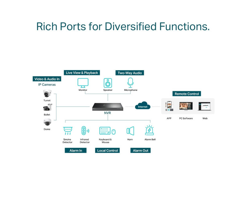 Na rekordéru najdete porty HDMI a VGA pro připojení monitoru či jiného zobrazovacího zařízení a také audio vstup i výstup pro obousměrnou konverzaci. Tato funkce se hodí například při nečekaných návštěvách či při vyzvedávání zásilek z rukou kurýra. Nechybí ani konektory pro připojení k síti Ethernet, který zajistí spolehlivé kabelové připojení pro nonstop nahrávání a monitoring záznamů.