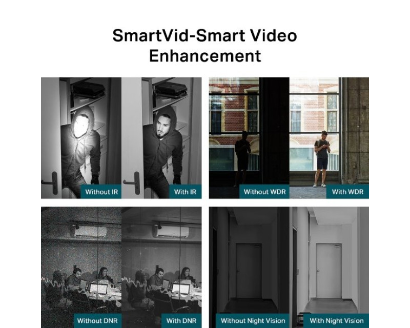 Vyzkoušejte všechny výhody technologie VIGI SmartVid. Vylepšíte si kvalitu i zpracování nahrávaných videí. Chytrý infračervený přísvit Smart IR zabrání podexponování objektů ve tmě nebo naopak jejich přesvícení. Dopřejete si pohled na detaily a prohlédnete si příchozí návštěvníky. O věrné vykreslení obrazu se postará funkce WDR, která minimalizuje efekty stínů a upravuje kontrast osvětlení. 3D DNR vám zajistí jasnější video bez zkreslení.