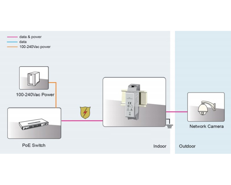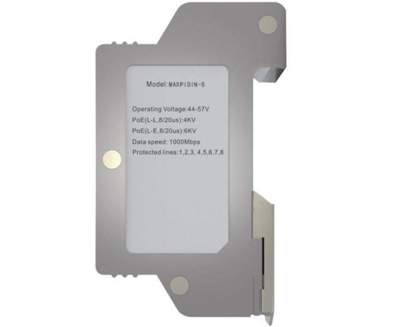 MAXPIDIN-S je jednoportová Gigabitová přepěťová ochrana od značky MaxLink určená pro vnitřní použití a moderní instalaci na DIN lištu. Tato přepěťová ochrana ochrání vaše zařízení na všech 8 pinech a nedělá ji problém ani PoE, kterým zařízení napájíte. Přepěťová ochrana podporuje normy 802.3af/at/bt ale také pasivní PoE a to až do napětí 60V DC a maximálně odebírané spotřeby 110W (max. 1A při 2-párovém, max. 2A při 4-párovém napájení). Vstupní a výstupní TP kabel se připojují do RJ45 portů, který jsou umístěny na horní a spodní straně bleskojistky.