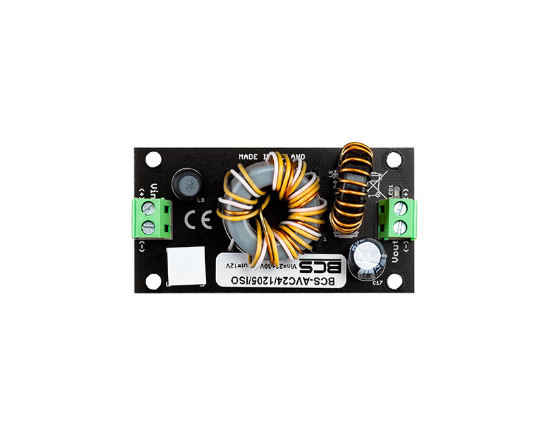 BCS power BCS power BCS-AVC24-1205-ISO je izolovaný stejnosměrný / stejnosměrný konvertor se sníženou funkcí. Zařízení poskytuje stabilizované výstupní napětí 12 V. DC / DC měniče jsou vysoce účinné moduly snižující napětí pro použití v CCTV systémech. Moduly lze použít v systémech, kde je nutné zachovat galvanické oddělení obvodů, např. pro eliminaci rušení obrazu vznikajícího v neizolovaných stejnosměrných napájecích systémech. Konstrukce OF (Open Frame) umožňuje zabudování zařízení do jakéhokoli krytu, ale nejpohodlnějším způsobem instalace jsou vyhrazená krytu BCS a montážní desky jsou vybaveny systémovým děrováním v rastru 10,8 mm. Je kompatibilní s roztečí montážních otvorů vestavěných modulů. Systémové řešení umožňuje vertikální nebo horizontální montáž vybraných zařízení do libovolné otevřené části krytu nebo montážní desky.