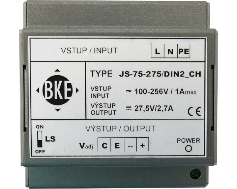 Průmyslový napájecí zdroj na DIN lištu BKE JS-75-240/DIN2 24 V, 75 W, 3 A, spínaný s ochranou proti zkratu na výstupu, přetížení a přepětí. Zdroj je vhodný pro napájení informační a telekomunikační techniky. Zdroj má účinnost vyšší než 85%.