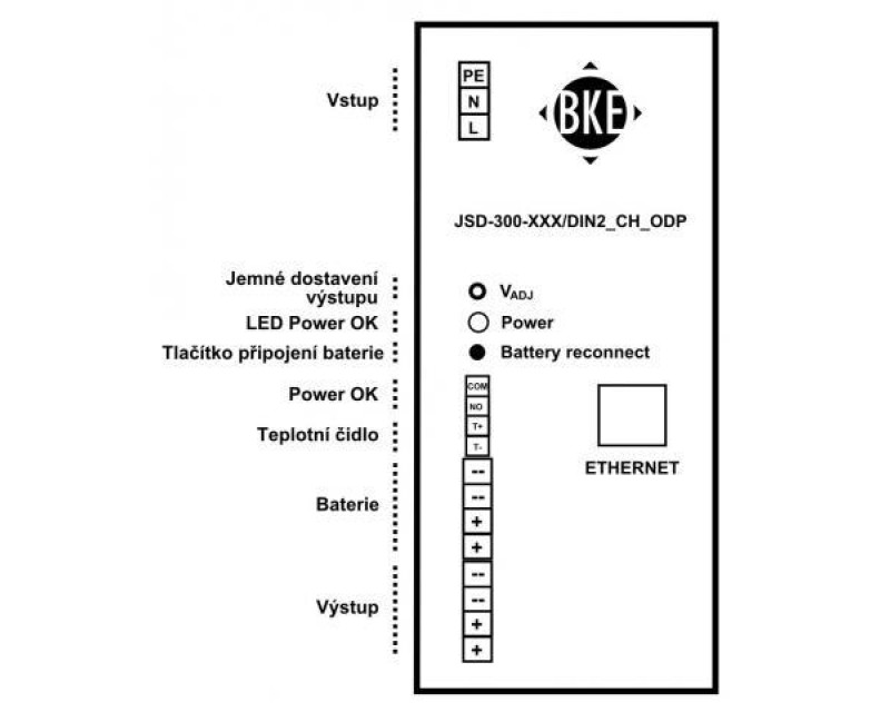 Průmyslový napájecí zdroj/nabíječ Pb akumulátorů na DIN lištu BKE JSD-300-275/DIN2_CH_ODP 27,5 V, 300 W, 10 A, spínaný s odpojovačem akumulátoru zabraňující jeho hlubokému vybití a poškození. Zdroj je vybaven dálkovým managementem pomocí SNMP nebo web rozhraní umožňující správu zdroje a zasílání alarmů při překročení nastavených parametrů. Dálkově je možní krátkodobě odpojit výstupní napětí a tím uajistit restart připojených zařáízení. Zdroj má ochranu proti zkratu a přetížení na výstupu, přepětí a podpětí na výstupu a tepelnou ochranu. Nabíječ je vybaven aktivní kompenzací účiníku (PFC). Zdroj je vhodný pro napájení informační a telekomunikační techniky s možností zálohování DC napětí. Zdroj má účinnost vyšší než 85%. Zdroj lze provozovat i bez připojeného akumulátoru.