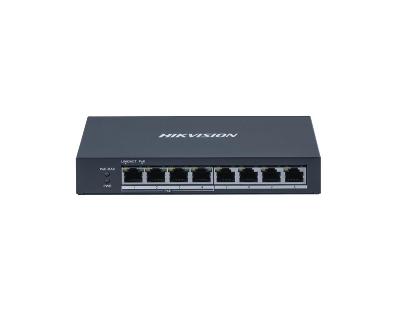 Switche a POE napájení HikVision 8 portový switch - 4x PoE 30W 1Gbps + 4x RJ-45 1Gbps, PoE celkem max. 60W, bez managementu, kovové šasi, bez ventilátoru, stavové LED, hmotnost 0.37kg, rozměry 170 x 28 x 93mm, provozní teploty 0°C až +40°C, napájení 48VDC 5W, zdroj součástí