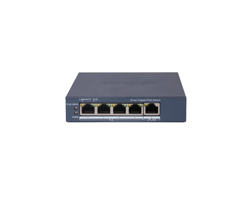 Switche a POE napájení HikVision 5 portový switch - 4x PoE 30W 1Gbps + 1x uplink RJ-45 1Gbps, PoE celkem max. 60W, základní management (v iVMS-4200), prodloužený režim (porty 1 - 4), kovové šasi, bez ventilátoru, stavové LED, hmotnost 0.26kg, rozměry 121 x 28 x 83mm, provozní teploty 0°C až +40°C, napájení 54VDC 0.9W, zdroj součástí