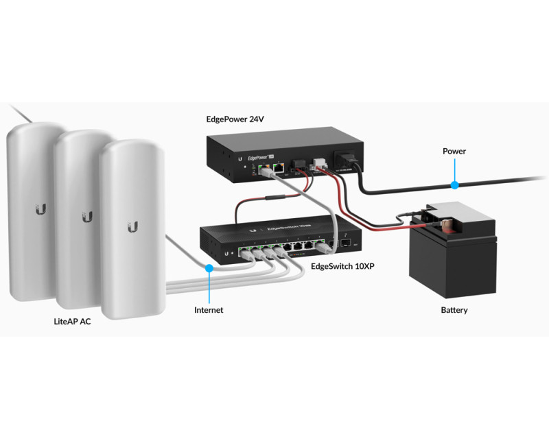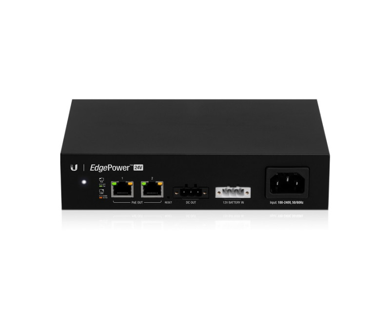 Záložní zdroj s PoE a funkcí UPS pro 24V systémy. Integrovaná ESD/EMP ochrana do hodnoty 12 kV. Vestavěné proudové omezení a ochrana proti zkratu akumulátoru. Výstupní napětí 24 V DC, zatížitelnost 72 W. Provozní teplota 0 až 40 °C. EdgePower 24V lze samozřejmě vzdáleně monitorovat a spravovat přes webové rozhraní UNMS.