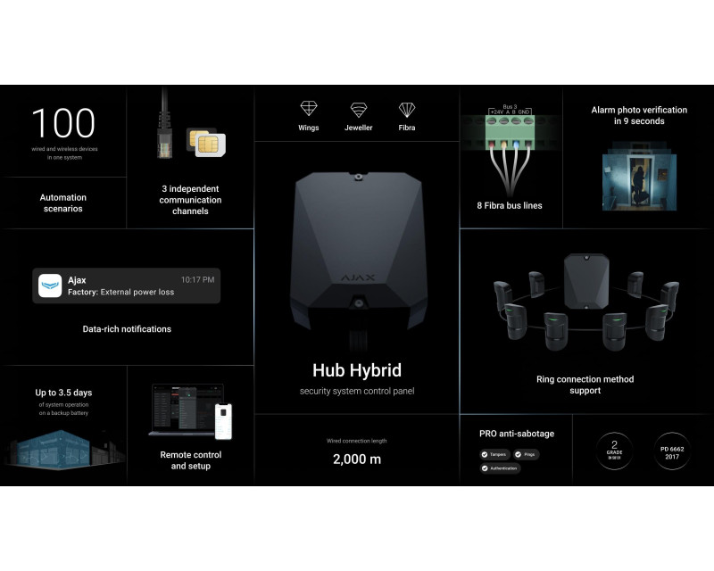 Ústředna Ajax Hub Hybrid (2G) je ovládacím panelem bezpečnostního systému Ajax podporující detektory pohybu MotionCam s funkcí foto verifikace poplachu. Jedná se o první ovládací panel Ajax podporující zařízení Jeweller i Fibra. Kombinací drátových a bezdrátových technologií lze dosáhnout komplexní ochrany. Ústředna shromažďuje informace o činnosti připojených komponentů v šifrované formě, analyzuje data a v případě poplachu upozorní uživatele systému a bezpečnostní agenturu. Panel je připojen k internetu pomocí Ethernetového připojení. Jako záložní komunikační kanál slouží dvojice SIM karet.