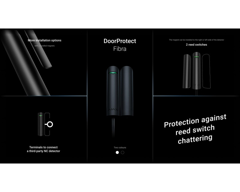 DoorProtect Fibra je vnitřní drátový detektor otevření. Své využití najde především při zastřežení oken a dveří všech typů a provedení. Zařízení se skládá ze dvou modulů – detektoru a magnetu. Detektor je připojen k ústředně drátově pomocí zabezpečeného protokolu Fibra. Dosah kabelového připojení je až 2000 metrů při použití krouceného páru U/UTP cat.5.