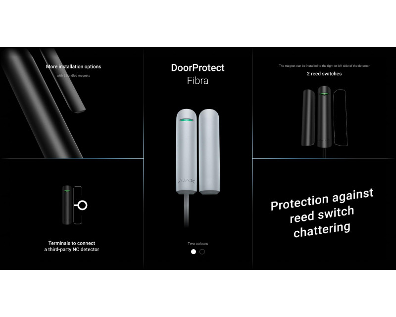 DoorProtect Fibra je vnitřní drátový detektor otevření. Své využití najde především při zastřežení oken a dveří všech typů a provedení. Zařízení se skládá ze dvou modulů – detektoru a magnetu. Detektor je připojen k ústředně drátově pomocí zabezpečeného protokolu Fibra. Dosah kabelového připojení je až 2000 metrů při použití krouceného páru U/UTP cat.5.