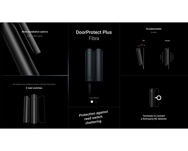 DoorProtect Plus Fibra je vnitřní drátový detektor otevření, otřesu a náklonu. Své využití najde především při zastřežení oken a dveří všech typů a provedení. Zařízení se skládá ze dvou modulů – detektoru a magnetu. Detektor chrání i okna, která zůstala otevřená kvůli ventilaci. Akcelerometr zaznamenává změny ve svislém úhlu sklonu, otřesy nebo vibrace a odesílá poplach do ústředny.