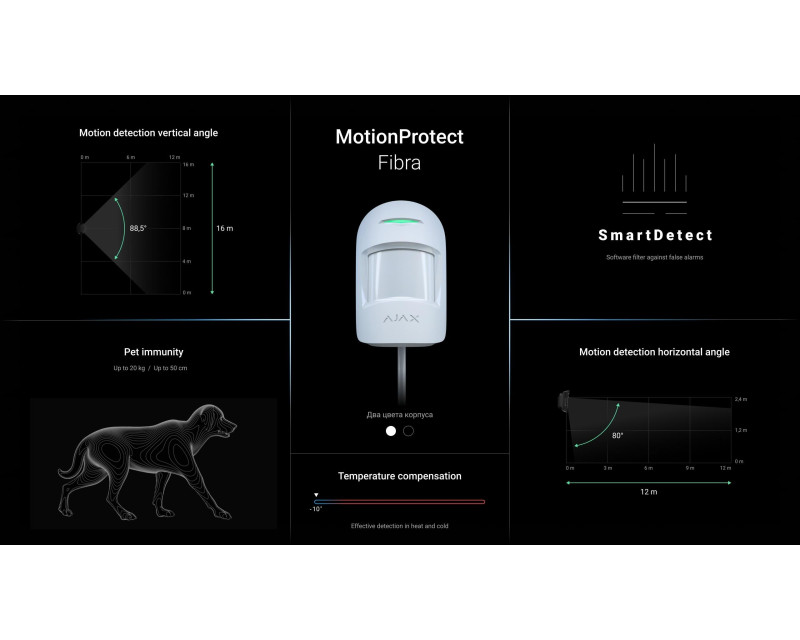 MotionProtect Fibra je drátový detektor pohybu s PIR senzorem. Zařízení dokáže detekovat pohyb na vzdálenost 12 metrů a vybaveno PET imunitou – ignorování pohybu domácích zvířat. Detektor je připojen drátově k zabezpečovacímu systému Ajax pomocí zabezpečeného protokolu Fibra. Dosah kabelového připojení je až 2000 metrů při připojení pomocí krouceného páru U/UTP cat.5.