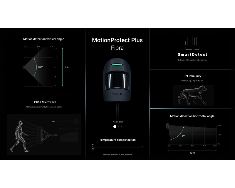 MotionProtect Plus Fibra je drátový detektor pohybu s PIR senzorem na vzdálenost 12 metrů. Zařízení navíc disponuje mikrovlnným detektorem, který eliminuje výskyt falešných poplachů způsobených intenzivním teplem – krb, topení atd. Detektor je určen pro použití v interiéru a dosah drátového připojení je až 2 000 m.