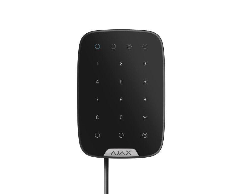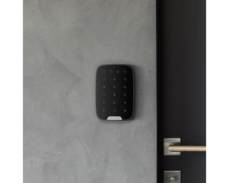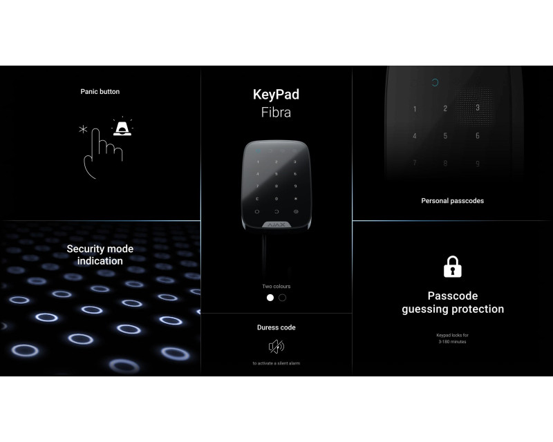 KeyPad Fibra je drátová dotyková klávesnice umožňující zastřežení/odstřežení zabezpečovacího systému Ajax zadáním kódu. V krizové situaci uživatel může na klávesnici diskrétně spustit tísňový poplach. Klávesnice je vybavena ochranou proti hádání hesla. Po třech neúspěšných pokusech o zadání kódu se zařízení uzamkne.
