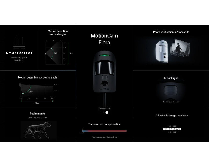 MotionCam Fibra je vnitřní drátový detektor pohybu s foto verifikací poplachu. Zařízení detekuje pohyb až na vzdálenost 12 metrů, samozřejmostí je PET imunita (odfiltrování pohybu domácích zvířat). Kamera se aktivuje pouze v reakci na vyvolaný poplach a pořídí sekvenci 5 snímků během jedné poplachové události.