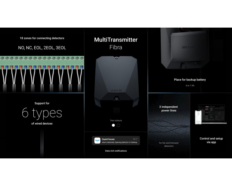 Integrační jednotka Multitransmitter umožňuje spárovat až 18 drátových detektorů třetích stran s bezpečnostním systémem Ajax. Zařízení disponuje 18 vstupními svorkami pro připojení zařízení typu NO, NC, EOL, 2EOL, 3EOL a vyhrazenou napájecí větví pro připojení požárních detektorů.