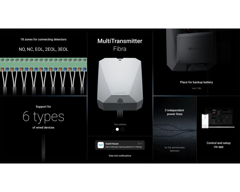 Integrační jednotka Multitransmitter Fibra umožňuje spárovat až 18 drátových detektorů třetích stran s bezpečnostním systémem Ajax. Zařízení disponuje 18 vstupními svorkami pro připojení zařízení typu NO, NC, EOL, 2EOL, 3EOL a vyhrazenou napájecí větví pro připojení požárních detektorů.