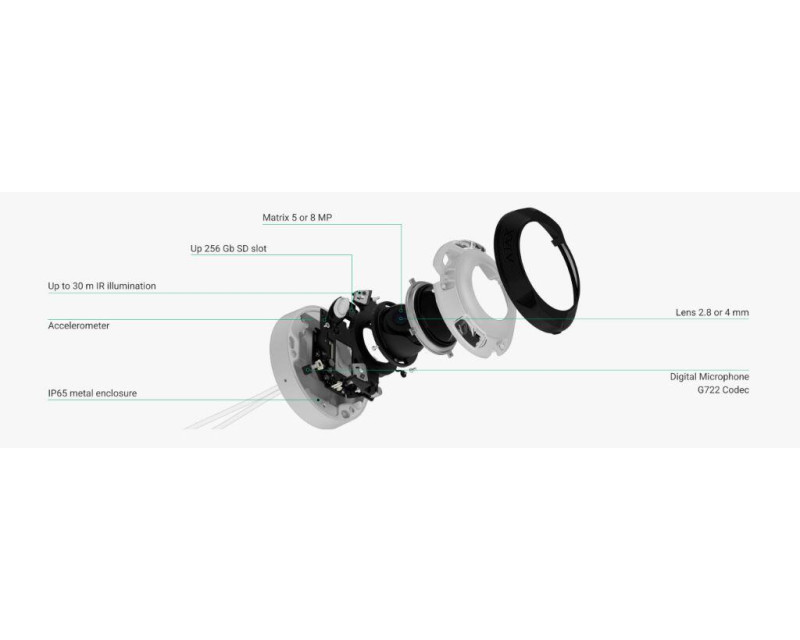 DomeCam Mini je IP kamera Ajax s rozlišením 3 840 × 2 160 px. Zařízení využívá AI k detekci a rozpoznání rozličných typů objektů, osob, vozidel a zvířat. Tím je zaručen relevantní záznam událostí, které skutečně stojí za vyvolaným poplachem. Pro ještě selektivnější a přesnější záznam lze aktivovat kameru pouze v momentě zastřežení systému Ajax. TurretCam funguje i v autonomním režimu bez nutnosti instalace NVR a záznam se ukládá na SD kartu.