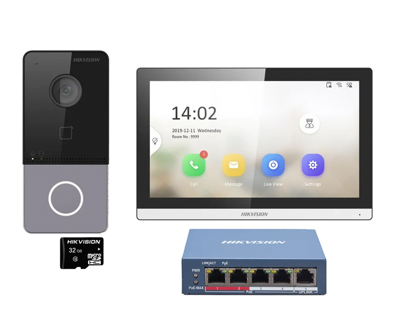 Sety IP videotelefonů HikVision Sada IP videotelefonu: 1x dveřní jednotka DS-KV6113-PE1(C), 1x vnitřní jednotku DS-KH6350-WTE1, 1x switch DS-3E0105P-E/M(B), 1x 32GB MicroSD