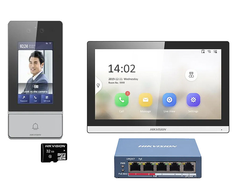 Sety IP videotelefonů HikVision Sada IP videotelefonu: 1x dveřní jednotka DS-KV9503-WBE1, 1x vnitřní jednotku DS-KH6350-WTE1, 1x switch DS-3E0105P-E/M(B), 1x 32GB MicroSD