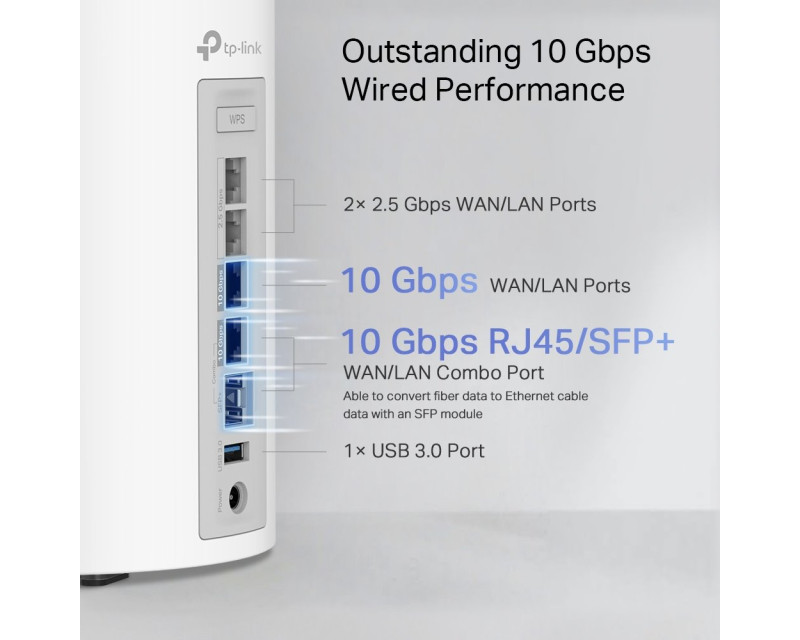 - Ethernet porty: 1x 10 Gbps, 1x 10 Gbps SFP+/RJ45 Combo, 2x 2,5 Gbps (na jednu jednotku Deco)