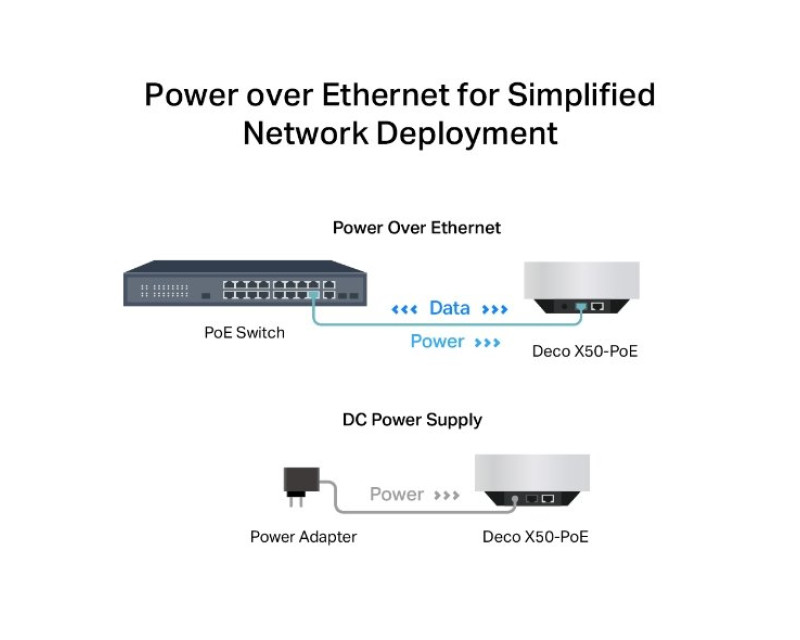 Router Deco podporuje PoE. Pomocí jediného ethernetového kabelu přenášíte data a zároveň napájíte zařízení. Jelikož je síťový adaptér součástí balení, vyzkoušíte všechny výhody PoE technologie.