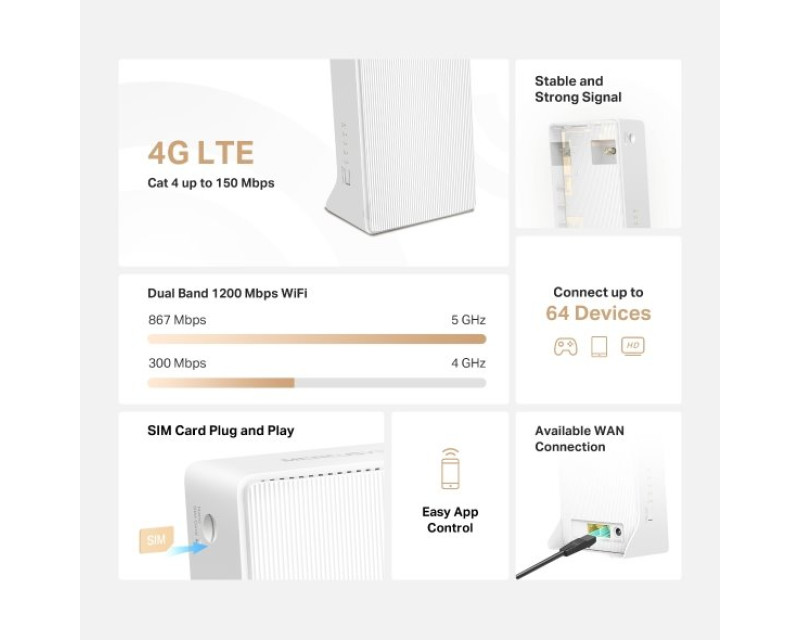 Modem TP-Link Mercusys MB 130-4G AC1200 využijete v domácnosti i kanceláři. Perfektně se hodí pro surfování na internetu, stahování aplikací, streamování a spoustu dalších činností. Nepotřebujete k tomu ani žádný kabel. Zařízení má vestavěný slot pro nano SIM kartu, pomocí které se připojíte k mobilní širokopásmové 4G LTE síti.