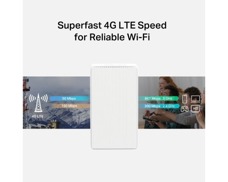 Dopřejte si kvalitní síť, i když bydlíte mimo dosah běžného širokopásmového připojení. Dvoupásmová Wi-Fi poskytuje rychlost připojení až 300 Mbit/s v pásmu 2,4 GHz a 867 Mbit/s v pásmu 5 GHz. Stahovat data budete rychlostí až 150 Mbit/s a odesílat rychlostí až 50 Mbit/s. Přístup k internetu můžete sdílet až s 32 zařízeními.