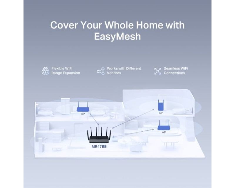 Router TP-Link je kompatibilní s technologií EasyMesh. Snadno tedy vytvoříte jednotnou síť složenou z více routerů a dalších jednotek. Spolupracují spolu a spolehlivě pokryjí celou vaši domácnost. Vytvořte si flexibilní a snadno nastavitelnou síť.