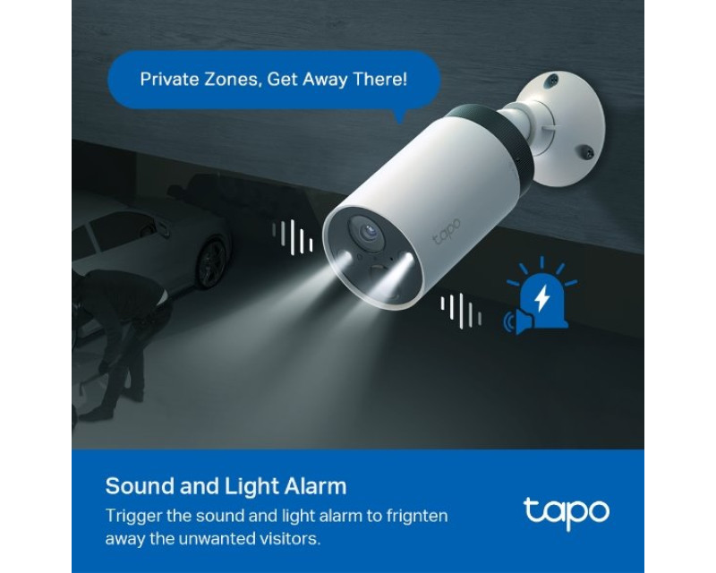 Model Tapo C420 při zaznamenání pohybu automaticky spustí hlasitou sirénu a zábleskové LED reflektory. Toto bezpečnostní opatření dokáže vyplašit případné nezvané hosty a narušitele soukromí.
