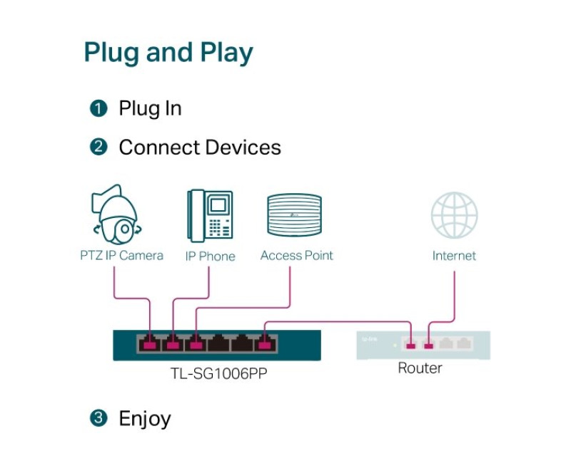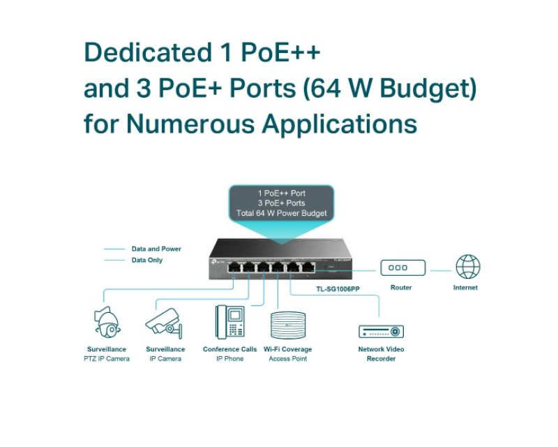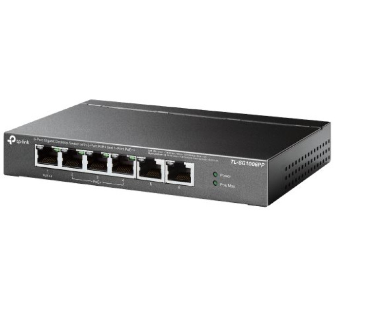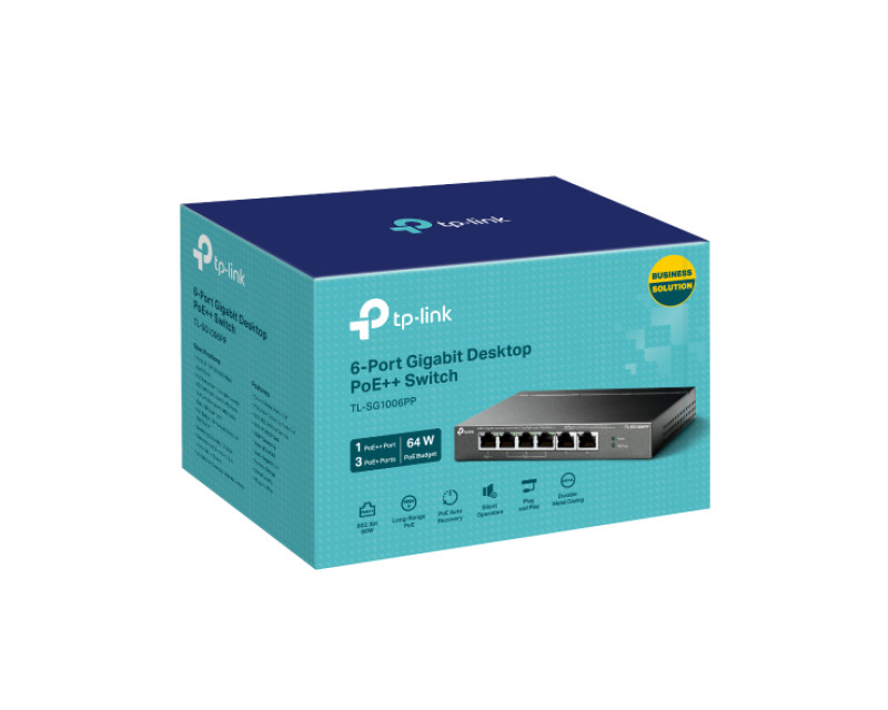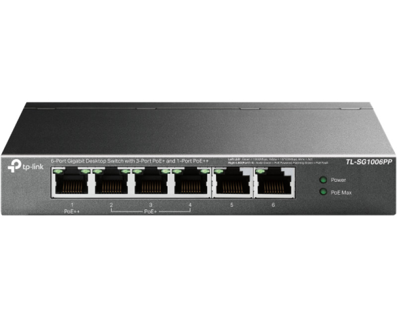 Switch TP-Link TL-SG1006PP je vybavený celkem šesti 10/100/1000Mbps RJ45 porty. Z toho má 1 PoE++ port a 3 PoE+ porty. Switch spolupracuje se standardem IEEE 802.3af/at/bt (kompatibilní s PD). Pomocí kabelu současně přenášíte data a napájíte zařízení. Port 1 (standard 802.3af/at/bt PoE++) poskytuje výkon až 60 W. Porty 2–4 (standard 802.3af/at PoE+) mají výkon až 30 W na každém PoE+ portu. Celkový výkon na napájení PoE dosahuje hodnoty 64 W. K přepínači připojíte IP kamery, přístupové body, IP telefony, počítače, tiskárny a další podobná kompatibilní zařízení.