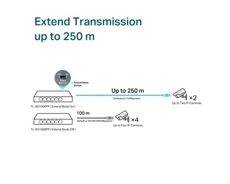 Switch TP-Link přenáší data a napájí zařízení v rozšířeném režimu až na vzdálenost 250 m. Tento rozsah využijete převážně pro IP kamery, které máte umístěné na různých místech pozemku. Rychlost portů v tomto režimu se sníží na 10 Mbps. Záleží také na spotřebě zařízení, která napájíte prostřednictvím PoE, a kvalitě a typu kabelu.