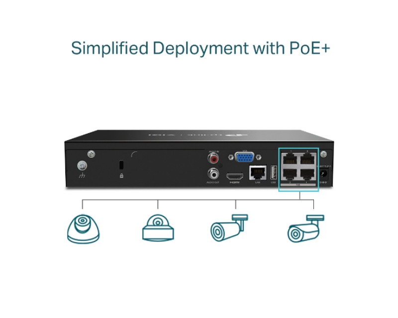 Na záznamovém zařízení najdete čtyři 10/100 Mb/s PoE+ porty. Každý z nich má výkon 30 W. Celkový PoE výkon switche dosahuje 53 W. Pomocí jediného ethernetového kabelu přenáší data i napájení. Nepotřebujete tedy žádný další napájecí adaptér.