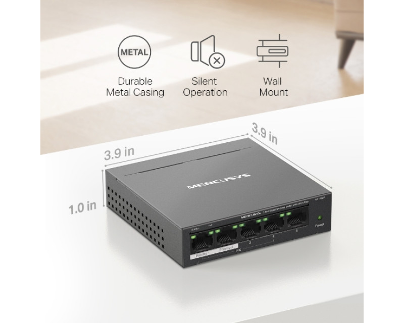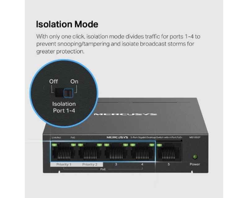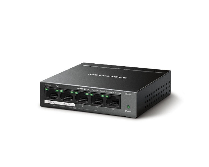 Se switchem Mercusys MS105GP od TP-Link získáte stabilní připojení, které se hodí hlavně v menších firmách, ubytovnách nebo kancelářích. Poskytne vám 5 plně gigabitových portů, z nichž 4 umožňují připojení PoE+. K napájení a přenosu dat vám postačí jeden ethernetový kabel.