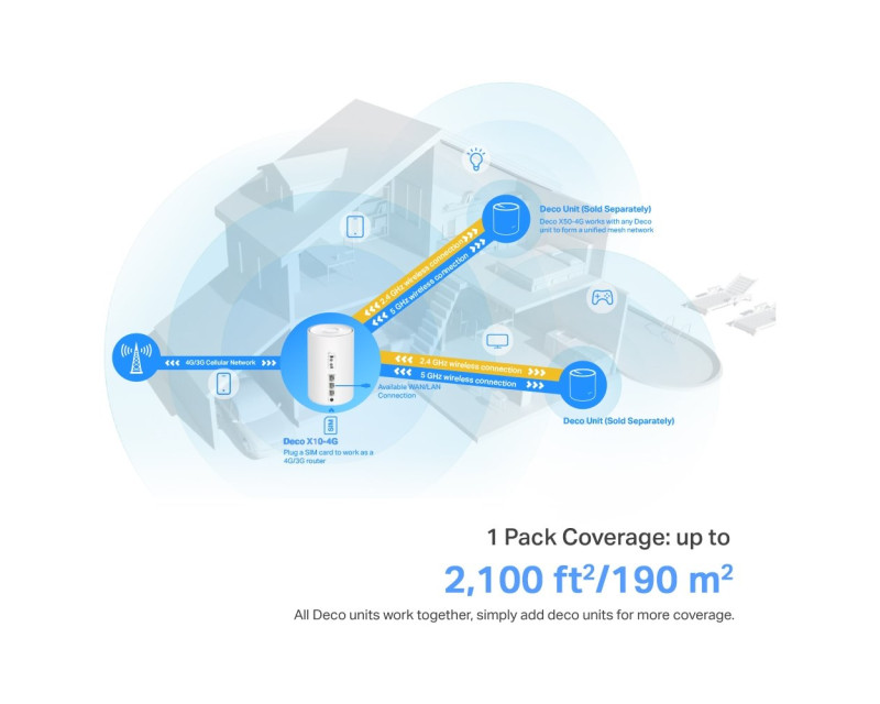 Zapojení modemu je opravdu snadné, stačí připojit SIM kartu. Technologii AX1500 Wi-Fi 6 si rozhodně oblíbíte. Jde totiž o systém navržený tak, aby pokryl celou domácnost a zaručil větší rychlost a vyšší kapacitu. Zároveň k němu připojíte až 120 zařízení a užijete si luxus, který vám Deco X10-4G poskytne. Rychlost připojení je 1 201 Mbps v pásmu 5 GHz a 300 Mbps v pásmu 2,4 GHz.