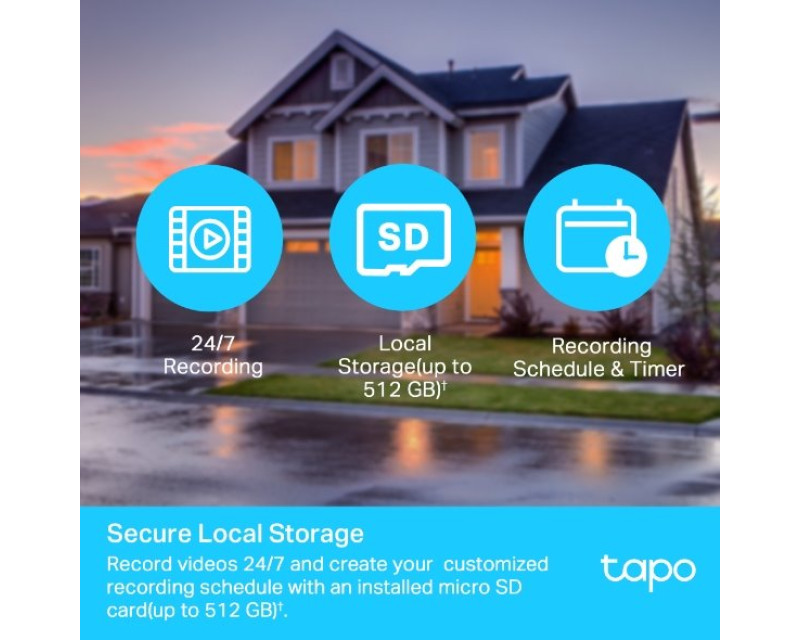 Kamera je vybavená slotem na microSD kartu s kapacitou až 512 GB. Pokud vám tento typ úložiště nevyhovuje, vyzkoušejte cloud Tapo Care. S jeho pomocí máte neustálý přístup ke svým záznamům.