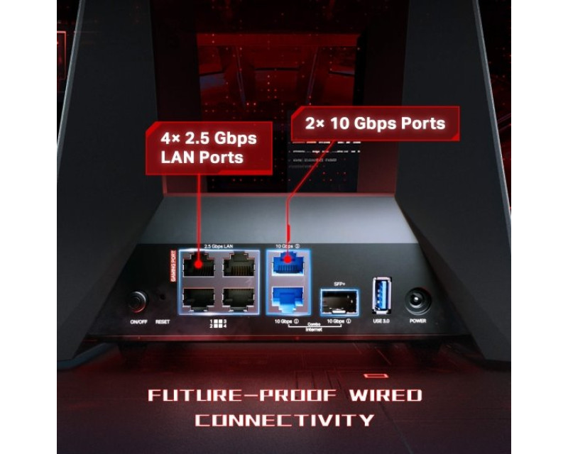 Na routeru najdete 1x 10 Gb/s LAN/WAN port SFP Combo, 4x 2,5 Gb/s LAN porty, 1x 10 Gb/s LAN port a jeden USB 3.0 port. Rozšiřují konektivitu a zajišťují flexibilní využití zařízení. Těšit se můžete na 4,8x větší rychlost, 4x nižší latenci a až 2x větší kapacitu sítě než u modelů s Wi-Fi 6/6E. Router podporuje velkou šířku pásma pro kabelové připojení zařízení. 10G LAN porty s až 10x rychlejším přenosem dat jsou ideální pro připojení herních notebooků či konzolí.