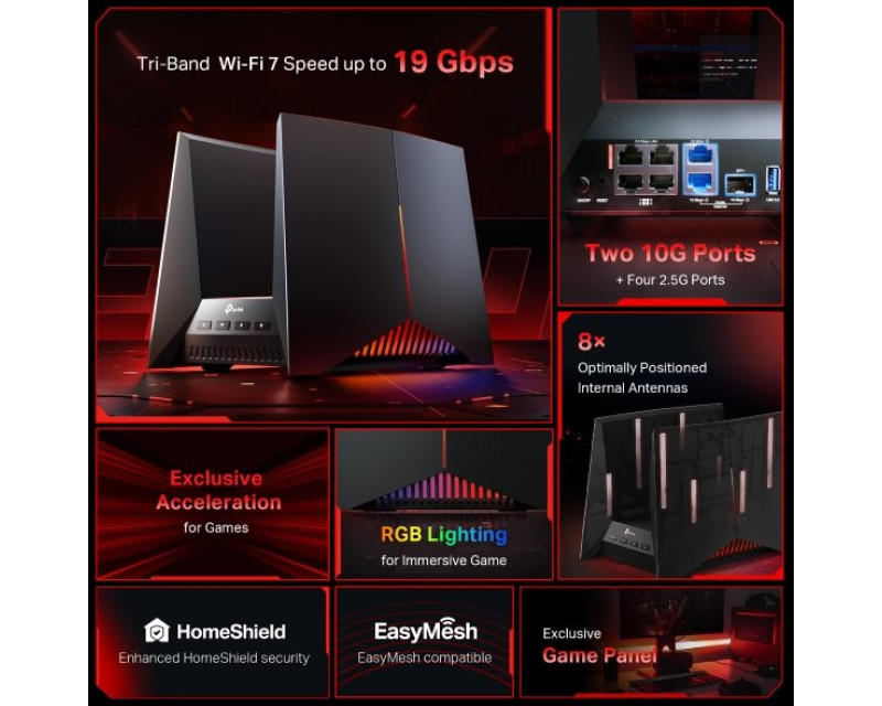 WiFi router TP-Link Archer GE800 BE19000, WiFi 7, 1x 10G WAN, 1x 10GLAN, 4x 2,5GLAN, USB, 2,4/5/6GHz, EasyMesh